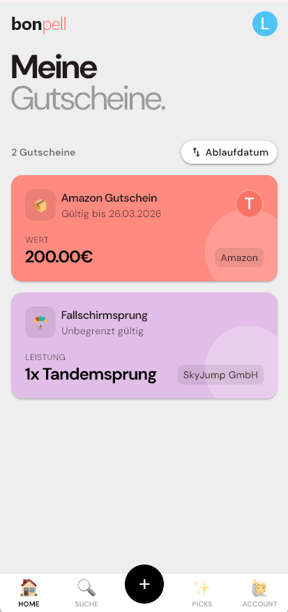 Schluss mit verlorenen Gutscheinen. Egal ob Fallschirmsprung, Massage oder Amazon-Guthaben — alles sicher in einer App.